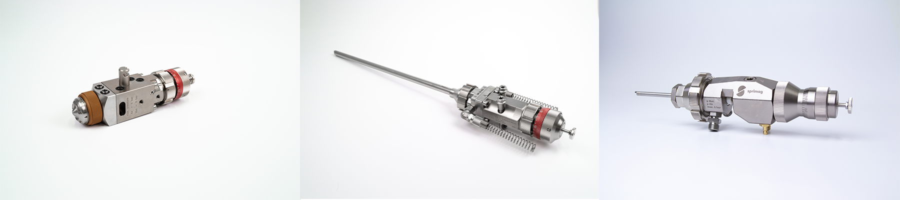 Mittlerweile finden sich in unserem Sortiment zahlreiche Spritzapparate für die automatische Spritzlackierung. Das Angebot reicht dabei von klassischen Spritzapparaten für die Oberflächenbeschichtung über Schleuderapparate bis hin zu unseren Innenspritzapparaten für die horizontale Innenlackierug von Aerosoldosen und Tuben. Dank eigener Teilefertigung können wir selbst ausgefallenste Beschichtungsanforderungen erfüllen, unser großes Spektrum an Düsensätzen und Verlängerungen für Spritzapparate wächst dabei stetig. Auch Sonderanfertigungen und Spezialdüsen stellen aus diesem Grund kein Problem dar.